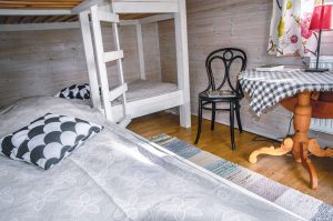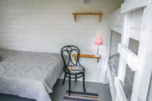 Stuga med 3 bäddar, 1 st bredare säng 120 cm och 1 våningsäng 70 cm. Trevlig stuga för den lilla familjen 3-4 pers. Egen stuga